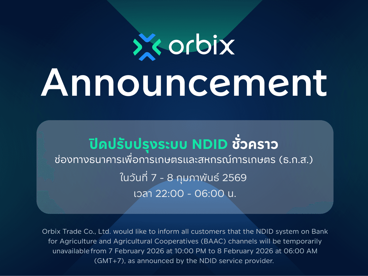 Orbix Trade Co., Ltd. would like to inform all customers that the NDID system on Bank for Agriculture and Agricultural Cooperatives (BAAC) channels will be temporarily unavailable from 7 February 2026 at 10:00 PM to 8 February 2026 at 06:00 AM (GMT+7), as announced by the NDID service provider.