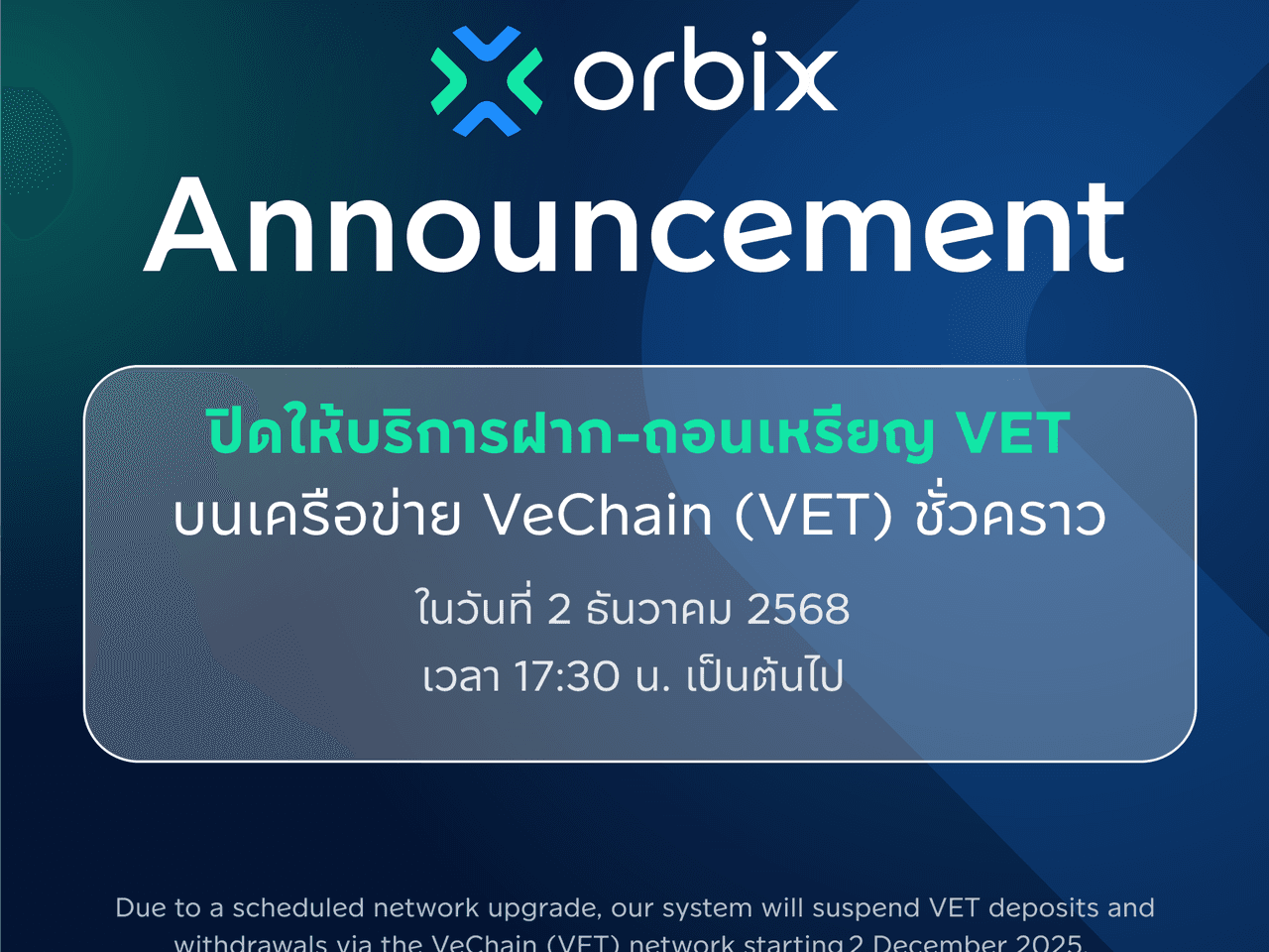 Due to a scheduled network upgrade, our system will suspend VET deposits and withdrawals via the VeChain (VET) network starting 2 December 2025, at 05.30 PM (GMT+7) until further notice.