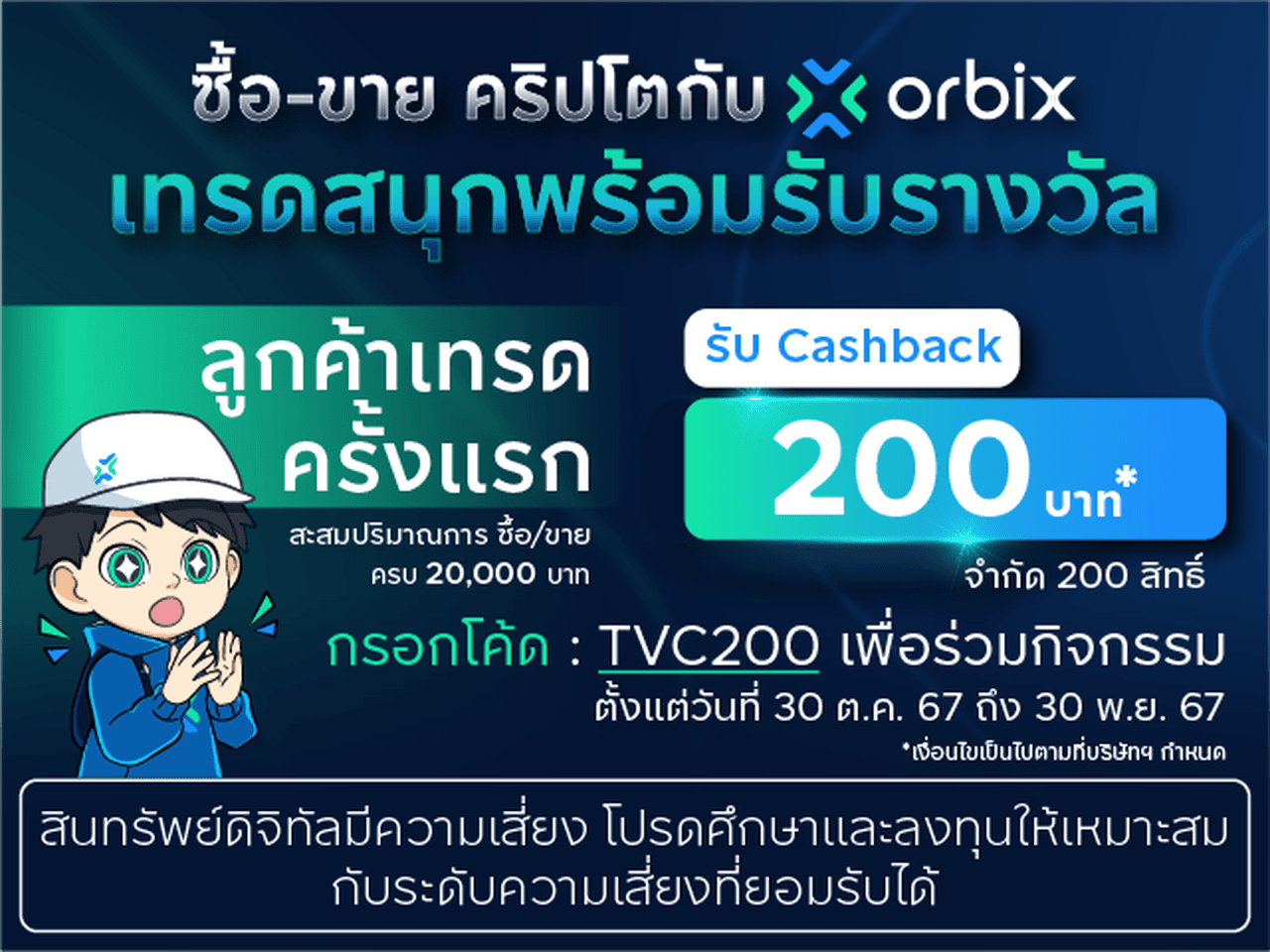 3.3 Customers who have not yet transacted with orbix and make their first trade with a minimum cumulative trading volume of 20,000 THB within the campaign period are eligible to receive 200 THB cashback. Eligibility is limited to the first 200 qualifying participants.