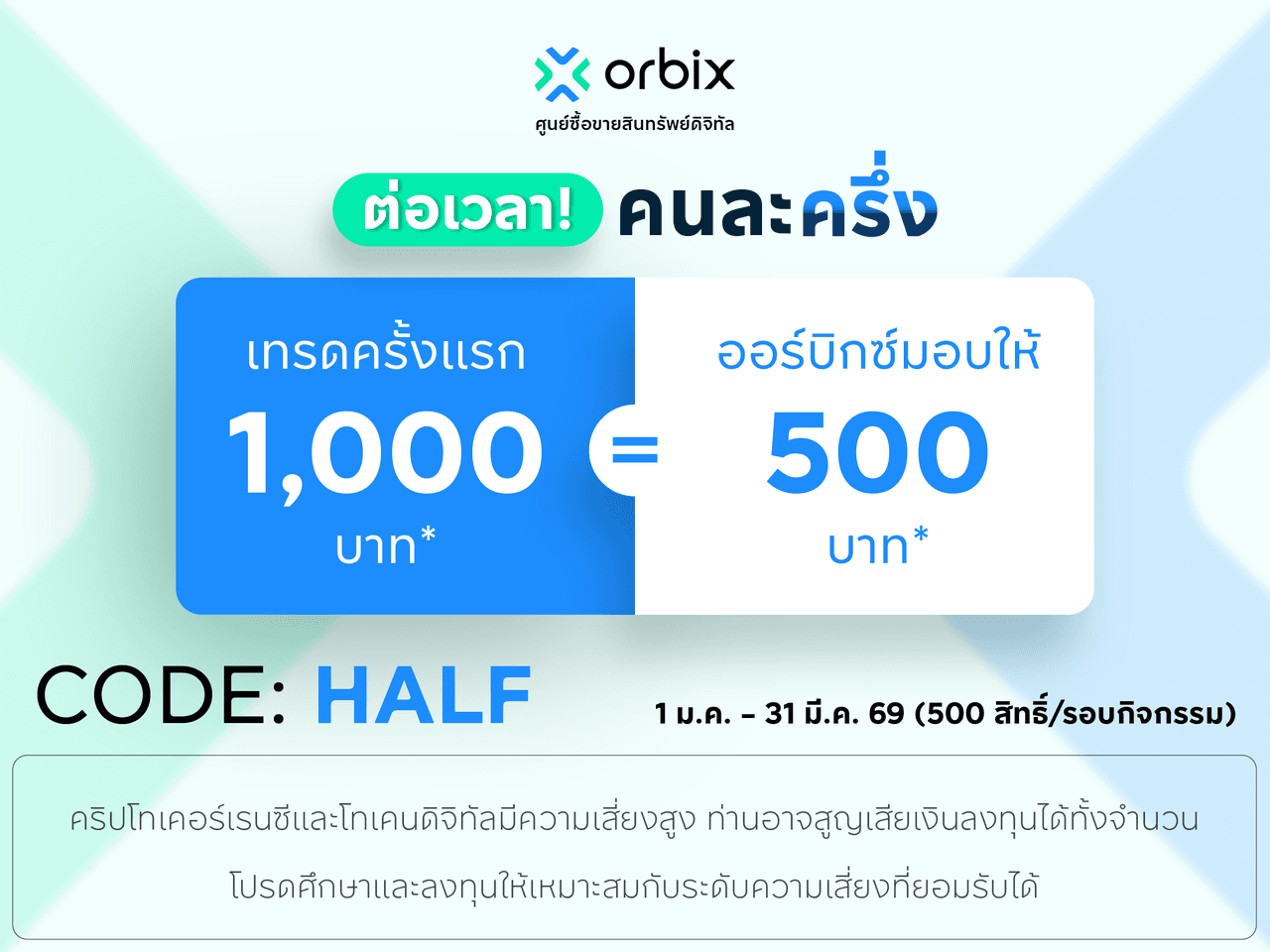 3.2 Customers who have not yet transacted with orbix and make their first trade with a minimum cumulative trading volume of 1,000 THB within the campaign period are eligible to receive 500 THB cashback. Eligibility is limited to the first 500 qualifying participants.