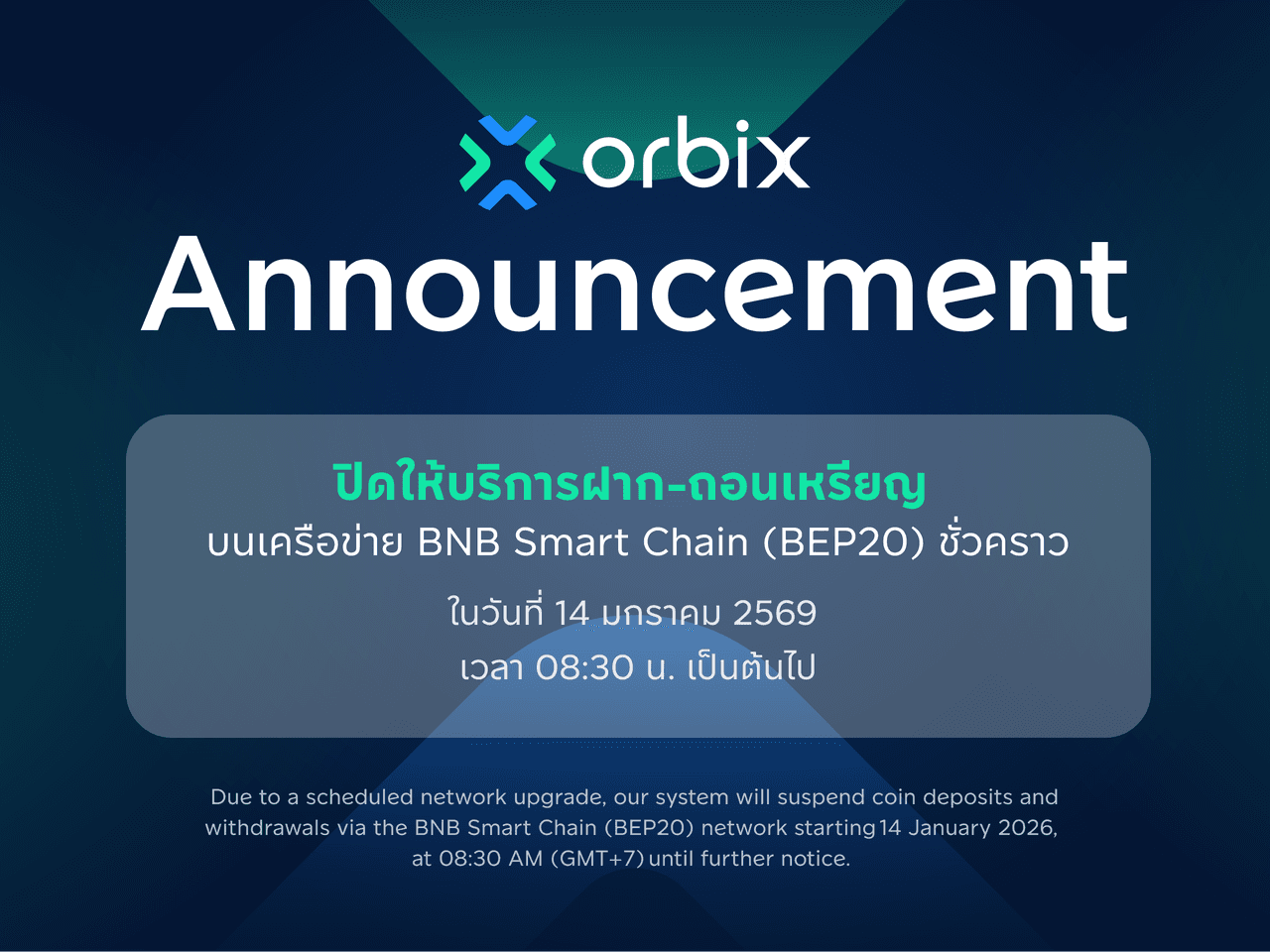 เนื่องจากเครือข่ายมีการปิดปรับปรุงเพื่อการอัปเกรดระบบ ทางบริษัทฯ จะทำการปิดให้บริการฝากและถอนเหรียญ บนเครือข่าย BNB Smart Chain (BEP20) เป็นการชั่วคราว ตั้งแต่วันที่ 14 มกราคม 2569 เวลา 08:30 น. เป็นต้นไป จนกว่าจะมีการอัปเดตจากเครือข่าย หรือประกาศบนเว็บไซต์ของบริษัทฯ ที่หน้า “ข้อมูลเหรียญ”