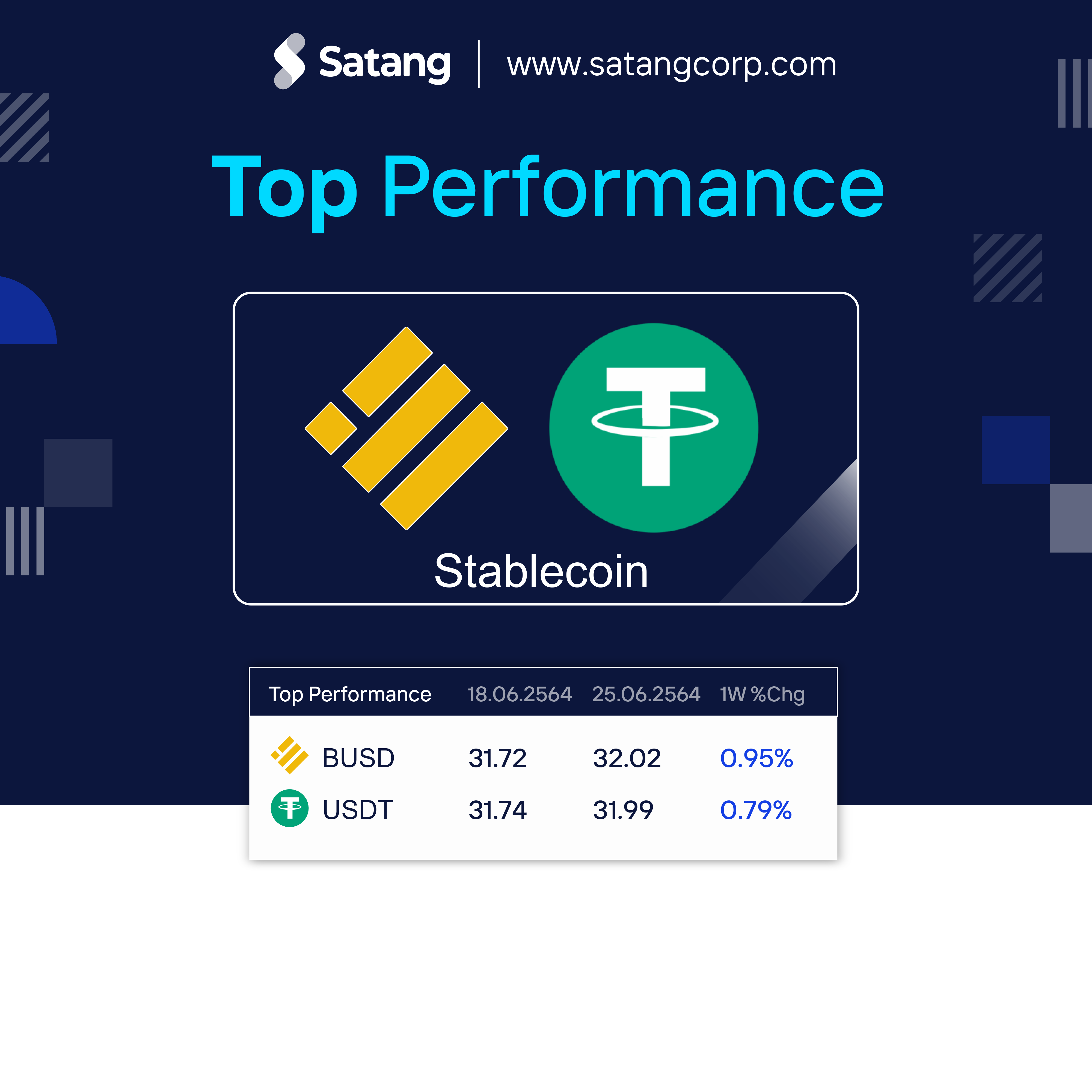 ถือได้ว่าเป็นอีกหนึ่งสัปดาห์อันแดงเดือดสำหรับตลาด Cryptocurrency ที่ราคาเกิดการเทขายลงมาอย่างต่อเนื่อง และส่งผลให้ราคาของเหรียญต่างๆ ปิดสัปดาห์ในแดนลบกันถ้วนหน้า และแน่นอนว่าเมื่อตลาดเกิดการเทขายทรัพย์สิน ราคาของ Stablecoin ก็มักเกิดการปรับตัวสูงขึ้นเป็นธรรมดา และคงหนีไม่พ้น USDT ผู้ครองสภาพคล่องของตลาดเจ้าเดิม และ BUSD ซึ่งเป็น Stablecoin จากทางยักษ์ใหญ่อย่าง Binance ที่ราคาได้เกิดแรงซื้อจากการ Panic Sell ของตลาด และส่งผลให้ราคาเกิดการปรับตัวสูงขึ้นเล็กน้อย แต่อย่างไรก็ตาม เมื่อตลาดเริ่มเข้าสู่สภาวะปกติราคาของ Stablecoin ก็จะกลับมาสู่สภาวะสมดุลเช่นเดิม Stablecoin จึงไม่ใช่สิ่งที่นำไปใช้เพื่อการเก็งกำไร เพราะมันเป็นเพียงแค่ที่หลบภัยในตอนที่ตลาดเกิดความผันผวนเท่านั้น