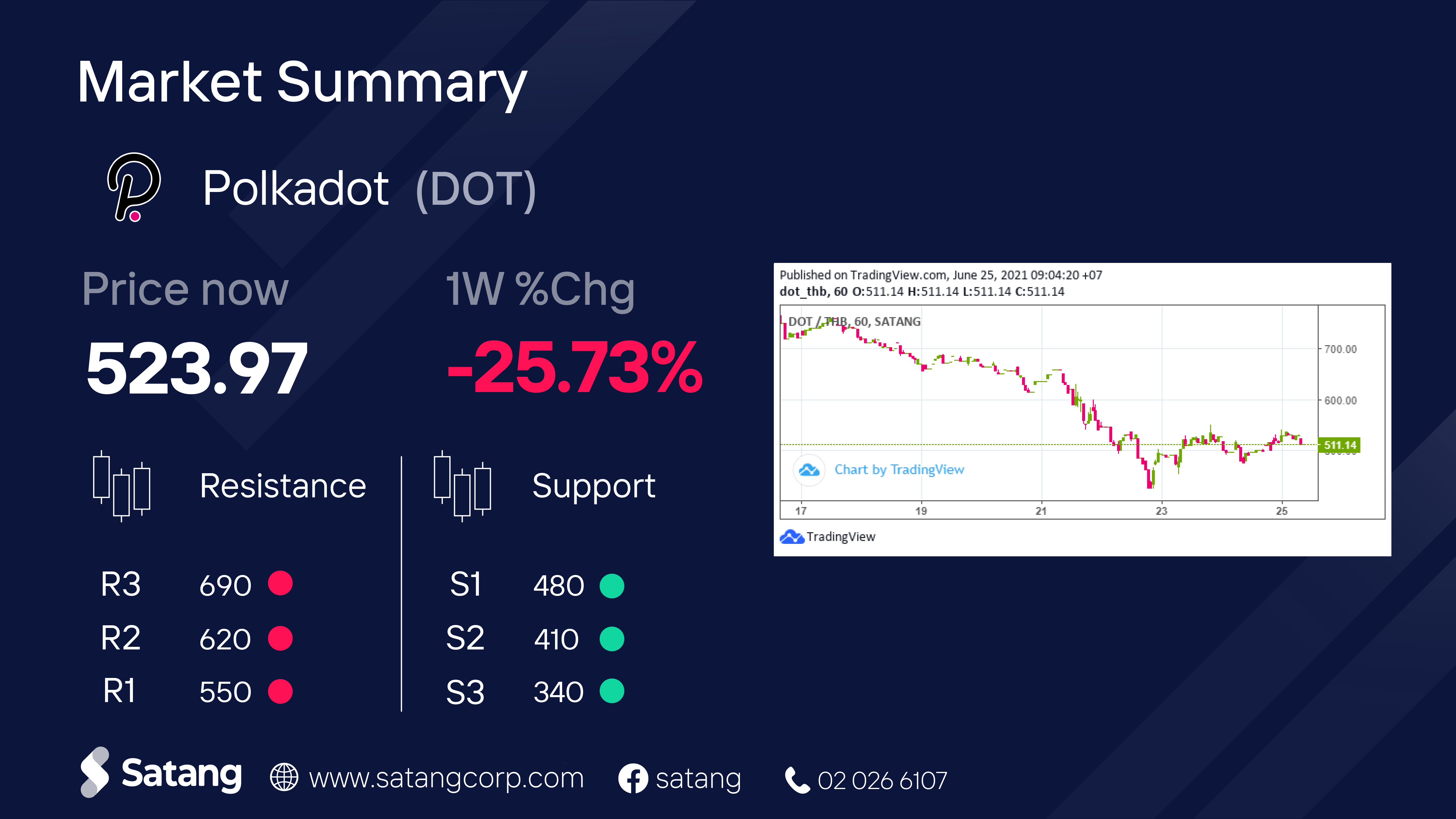 เกิดแรงเทขายตามกระแสตลาดในช่วงต้นสัปดาห์ ส่งผลให้ราคาเกิดการปรับตัวลงตามที่ได้คาดการณ์ไว้ในสัปดาห์ก่อนเป็นที่เรียบร้อย ต่อมาในช่วงท้ายสัปดาห์ แม้กระแสตลาดจะเกิดแรงซื้อคืนกลับในปริมาณที่มาก แต่ DOT กลับยังมีแรงซื้อคืนกลับที่ค่อนข้างน้อย ซึ่งเป็นการสะท้อนว่าในระยะสั้นอาจเกิดการปรับตัวสูงขึ้นได้ ทำให้แนวรับปัจจุบันถือเป็นจุดซื้อที่ค่อนข้างดี แต่ในระยะกลาง-ยาวราคายังคงเป็นเทรนด์ขาลงอย่างต่อเนื่อง จึงแนะให้บริหารความเสี่ยงเป็นหลัก เพื่อลดความเสี่ยงจากความผันผวน และติดตามสัญญาณการซื้อขายอย่างใกล้ชิด โดยมี